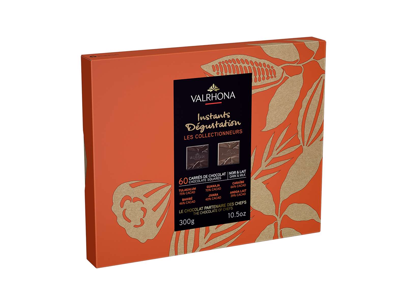 Mælkechokoladefirkanter (min. 39 % kakao, rent kakaosmør) og mørke chokoladefirkanter (min. 66 % kakao, rent kakaosmør).