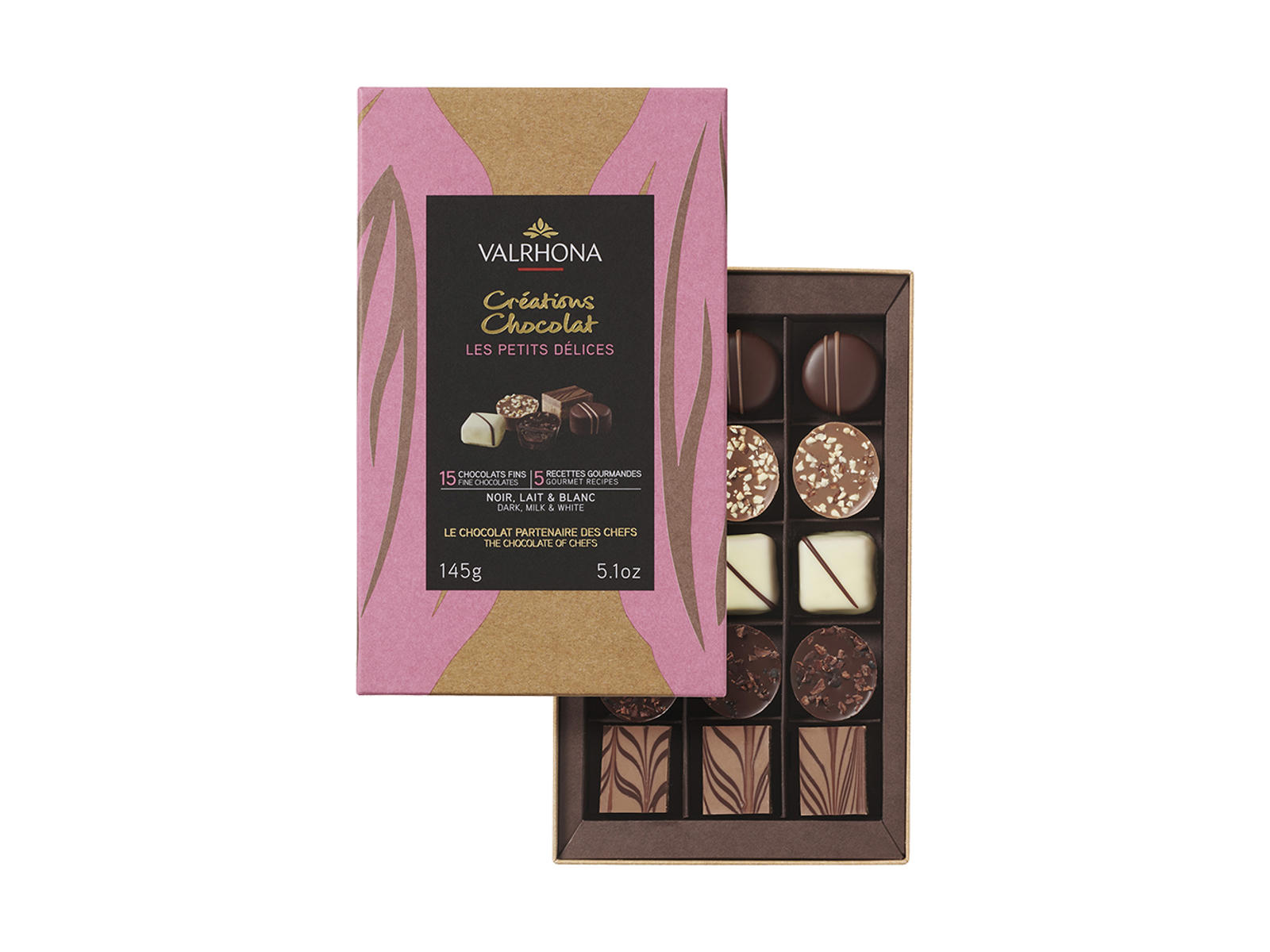 Valrhona Petits Fyldte chokolader med mørk, mælk & hvid chokoladeovertræk